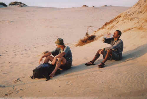 16.7.2001 Po dlouhých prípravách, hledání na internetu, behání na nádraží pro nezbytné informace konecne nadešla ona chvíle, náš den D, kdy jsme nechali doma své manželky, milenky, rodice, bratry a sestry, krecky a potkany. Nic nezmohl jejich plác, už jsme nechteli couvnout. Severní vítr k našim nosum privál chut vzdálených kraju a probudil naše cestovatelské pudy, které již nešlo nijak potlacit. Byli jsme v tom až po uši. V 13:00 jsme s Pavlem nasedli na hlavním nádraží v Praze do rychlíku, který nás mel dovézt až do Warszawy a odtud hurá na daleký sever Polska.V 16:00 jsem již netrpelive postával na olomouckém nádraží na vlak, který se mel na nekolik málo hodin stát mým domovem. ( Bohužel to nebylo nekolik málo hodin, ale celá vecnost ). V 16:10 již rozesmátý Milda, zpola vystrcený z okýnka prijíždejícího expresu, vítal me svou obrovskou mávající tlapou. V plném kupé cítající jednu Cešku, Polku a vysmátého Asiata - me jsme se všichni rychle uvelebili a probrali v minute vše, co se událo za tu dobu, co jsme se nevideli a v monotónním rytmu ubíhajících pražcu jsme se nechali unášet vstríc budoucím zážitkum prstem po mape smerem sever. V 19:30 jsme prekrocili polskou hranici. Konecne jsme v cizine. Ve 20:00 se strhla bourka, s kterou zacalo naše polské dobrodruž ství. Blesky protínaly oblohu jeden za druhým, doprovázeny hromy a obrovské proudy vody se valily k zemi a kroupy na sebe nenechaly dlouho cekat. Najednou se náš skvele rozjetý polský vlácek zastavuje ve stanici nejak na dlouhou dobu. Jak se dozvídáme od naší spolucestující, která umela cesky, na trati se vyskytly problémy v podobe spadlého stromu a zpoždení vlaku bylo vycísleno na 180 minut. No to asi nestihneme náš prípoj ve Warzawe. Porád ale veríme, že se treba rozjede. Nesmím zapomenout ani na naší milou spolucestující, která, puvodem polka, nám delala celou cestu vlakem pruvodce a prekládala nám hlasy hovorící z amplionu na peróne. Dozvedeli jsme se od ní radu cenných informací a pohovorili jsme i o Ceské republice. Nedalo se nic delat a my jsme sedeli ve vlaku a cekali. Cas jsme si krátili procházením se po peróne a pozorováním hezkých devcat, kterých tu bylo požehnane. Vlak se nakonec s velikým zpoždením rozjel a celá cesta až na Warzawské nádraží probehla bez nejmenších komplikací. Vystoupili jsme na Warszawa Wschodnia odkud jsme doufali, že nám pojede další prípoj až do vzdálené Leby.Popis cesty z Prahy do Warzawy – Odjez z Prahy Hlavního nádraží v 13:05 Praha Liben 13:15 Kolín 13:48 Pardubice Hlavní nádraží 14:21 Ceská Trebová 15:10 Olomouc Hla vní nádraží 16:11Hranice na Morave 16:50 Ostrava Svinov 17:41 Ostrava Hlavní nádraží 17:50 Petrovice u Karviné 18:30 Zebrzydowice 18:39 Katowice 19:40 Sosnowiec Gl. 19:53 Zawiercie 20:17 Warszawa Zachodnia 22:15 Warszawa Centralna 22:27 Warszawa Wschodnia 22:34 Tento rozpis odjezdu vlaku nebyl kvuli neprízni pocasí a havárii na kolejích dodržen, slouží ciste orientacne pro ctenáre ! Nádraží vypadalo celkem prátelsky a proto jsme se domnívali, že nebude problémem zde preckat pár hodin než se rozední a než prijede nejaký vlak, který nás poveze na sever. Šli jsme se projít po nádraží a chteli jsme zjistit, v kolik nám pojede další vlak. Paní na informacích nám porozumela a ukazuje na monitor pocítace, že další vlak nám jede o šesté hodine ranní. Vrátili jsme se zpet na lavicku, která stála osamocene v koute nádraží , vyndali cajík a sušenky a rozhodli jsme v klidu vyckat a posedet, než se vlak urácí prijet. Jo, krásne to utíkalo a z nekonecných ctyr hodin na zacátku jsou už jen pouhé ctyri minuty a my se netrpelive tešíme na vlak. Perón se zacal k našemu velkému prekvapení plnit lidmi, vlak bude narvanej, honilo se nám v hlave. Vlak ( rychlík nesl název Poseidon ) prijel o šesté hodine kupodivu na cas a lidicky se zacali rvát do vlaku. Vlak byl beznadejne naplnen, samá místenka a nikde jediné volné sedadlo. Tak jsme zvolili posed v ulicce u zachodku, kde si bylo možno na rozloženou karimatku i lehnout a trochu se prospat, což jsme cinili opravdu z nadšení, nevšímajíc si lidí a jejich pohledu. Zde jsme meli strávit nejakých osm hodin jízdy až do naší poslední zastávky, kterou se mela stát prímorská Leba. Cesta byla super, vláce utíkal krajinou a obcas se bylo i na co koukat, tak jsme chvilku pospali, jedli, pozorovali krajinu ubíhající kolem vlaku atd. Co se dá jiného v nacpaném vlaku delat. Ve spánku nás porád rušili lidé, kterí pendlovali vlakem sem a tam a porád nás rušil pruvodcí, který se nás porád na neco vyptával polsky a my mu odpovídali porád stejne: ”Prosím” a vždy otrávene odešel, když videl, že s námi žádná rozumná rec nebude. Netrvalo dlouho a my jsme se ocitli v Leborku, kde již na nás cekala lokálka do Leby.Popis cesty Warszawa – Lebork : Jenom nekterá mesta – Malbork Tczew Gdansk Sopot Gdynia Lebork Bohužel casy nemohu poskytnout, jen približnou informaci, že cesta trvala zhruba osm hodin a pochopili jsme, že vlaky jezdící na významnejších trasách nemívají zpoždení. V Leborku jsme chvátali do lokálky, která mela už dávno jet, ale vlak mel zpoždení, tak nemelo cenu pospíchat. Jsme tak unaveni, že je nám zpoždení úplne ukradené a hned po usednutí usínáme. Pruvodcí nás probouzí a my mu ukazujeme naše mezinárodní lístky, hledí na ne s patricnou duležitostí, ale spíše vubec netuší o co jde, tak nám je vrací a po zbytek cesty si nás nevšímá. Informace o našich jízdenkách – Jízdenky jsme na radu zakoupili na hlavním nádraží v Praze u spolecnosti WASTEELS, která nám prodala jízdenku na ctyri dny, takzvané Euro domino, které nabývalo svou platnost vždy od 19 hodiny a platilo 24 hodin, 
